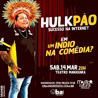 Sucesso na internet, @hulk_pao estará em Manaus dia 14 de março no Teatro Manauara com seu novo show pela primeira vez na cidade! Simbora todo mundo assistir "Um índio na comédia?" - Vendas nas centrais e site: https://www.obaingressos.com.br/event/HULK-P%C3%83O