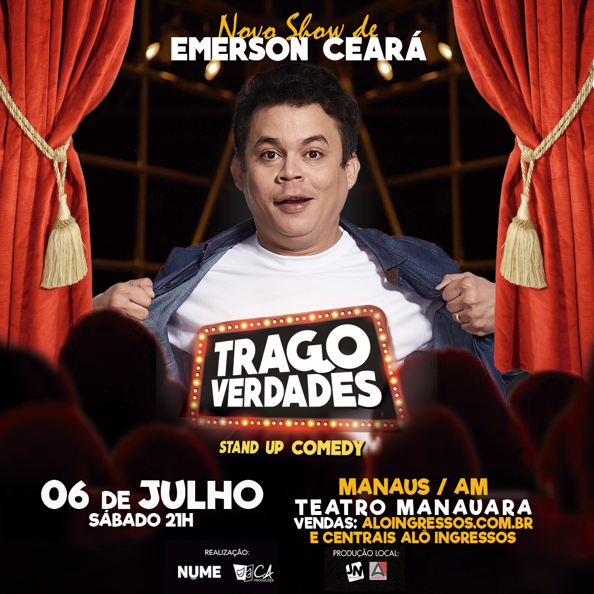 Emerson Ceará "a LENDA" em Manaus dia 06 de Julho com meu solo, TRAGO VERDADES e espero todo mundo lá. Vai ser um cabaré doidoooo! Local: Teatro Manauara Data: 06 de Julho, SÁBADO às 21Hors Vendas: ALO INGRESSOS: OU nos Quiosques da Alo Ingressos Ingressos: R$ 35,00 meia / R$ 70,00 inteira