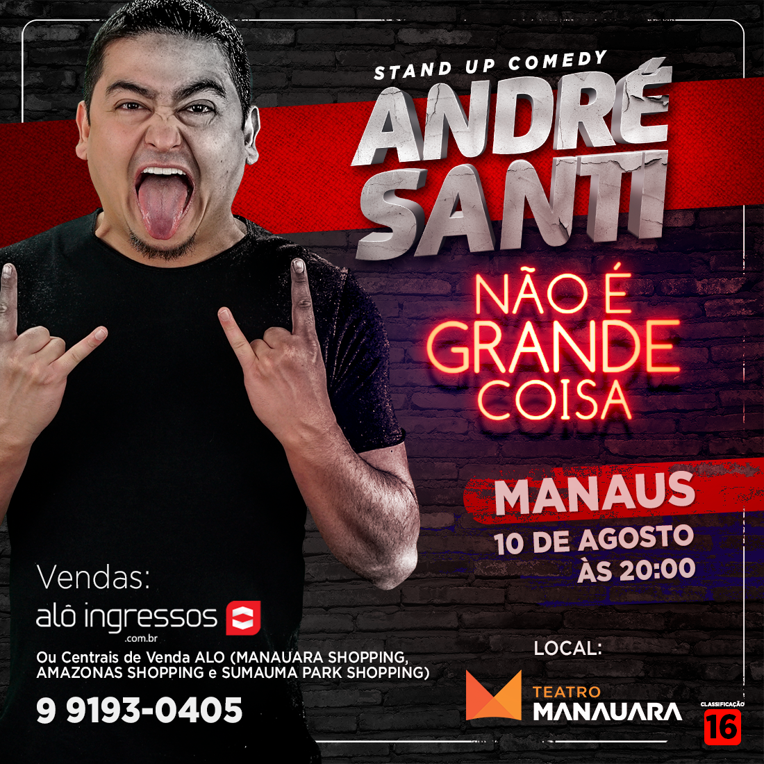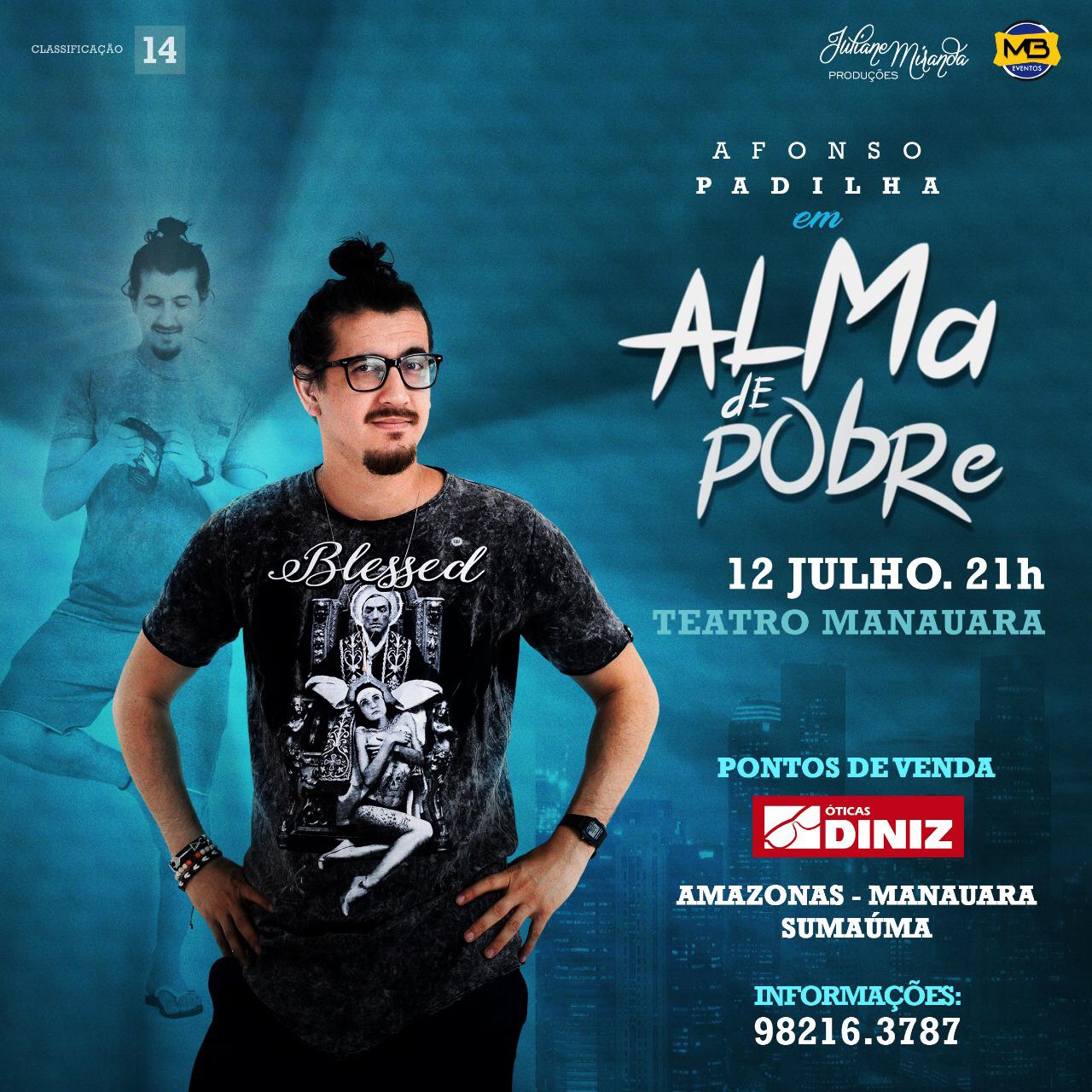 Afonso Padilha com seu standup “Alma de Pobre” dia 12 de julho no teatro Manauara, imperdível! Corre que os ingressos já estão esgotando. Ponto de vendas: Ótica diniz dos Shoppings ( Amazonas, Manauara e Samauma ) Vendas online: www.shopingressos.com Informações: 98216-3787